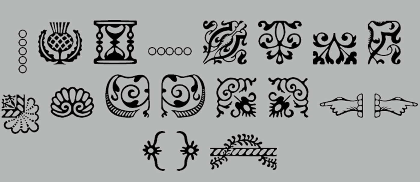 Ornaments: Used as flourishes in certificates and invitations. They usually provided as a font in a larger typeface family. Only a few classical and traditional typefaces contain ornamental fonts (Adobe Caslon Pro).